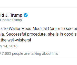 Washington DC, lundi 14 mai 2018 ((rezonodwes.com))–Son mari, le président Donald Trump qui n’était pas à son chevet durant les heures de la procédure chirurgicale, a tweeté lundi en fin d’après-midi, qu’il était en route vers l »hôpital Walter Reed « to see our great First Lady, Melania« .