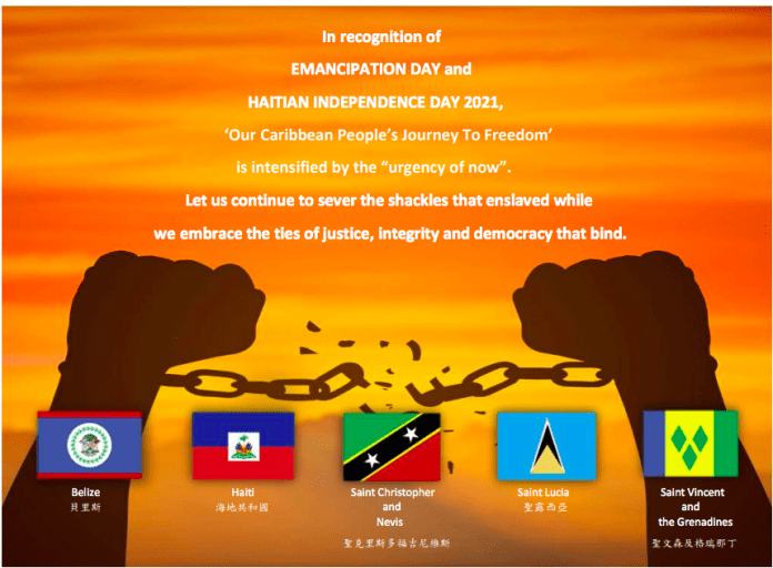 A l’initiative de Taïwan, 5 pays des Caraïbes incluant Haïti célèbrent dimanche la « Journée de l’Emancipation et l’Indépendance d’Haïti vis-à-vis de la France » August 1, 2021