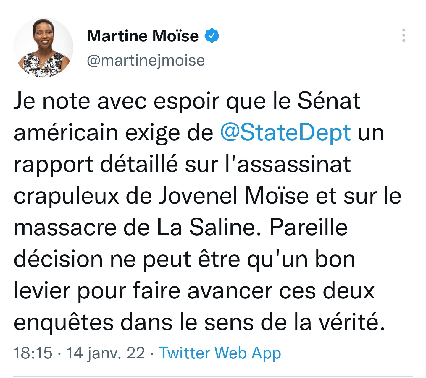 « Mwen gen anpil espwa paske Sena ameriken an egzije @StateDept yon rapò detaye sou lanmò terib PDT Jovenel Moïse ak masak Lasalin. Yon desizyon konsa kapab yon bon mwayen pou limyè verite blayi sou 2 ankèt sila yo », a écrit l’ancienne première dame ce soir.