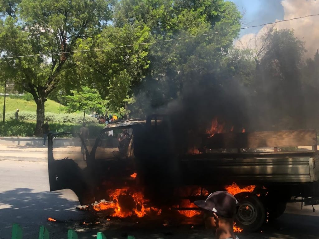Plusieurs personnes sont blessées et un véhicule de la Police Nationale d’Haïti (PNH) est incendié, ce mercredi 16 octobre 2019, au Champs-de-Mars (Port-au-Prince), à l’occasion des funérailles de militants politiques décédés lors des manifestations dans les rues qui visent à réclamer la démission du Président de la République Jovenel Moïse