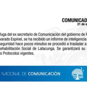 « Suite à l’évasion de Fernando Alvarado Espinel, ancien secrétaire à la Communication du gouvernement Rafael Correa, un rapport de services de renseignement de la police a été reçu et, pour des raisons de sécurité, il y a quelques minutes, Jorge Glas a été transféré au centre de réadaptation de Latacunga.« a poursuivi le communiqué.