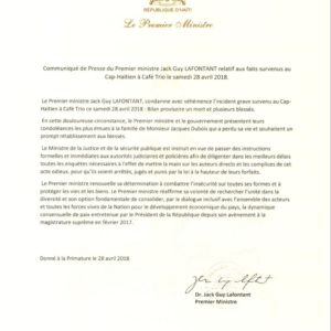 Dans une note de presse rendue public aujourd’hui, le premier ministre Jack Guy Lafontant “condamne avec véhémence l’incident grave” et présente ses “condoléances les plus émues à la famille de Monsieur Jacques Dubois qui a perdu sa vie”.